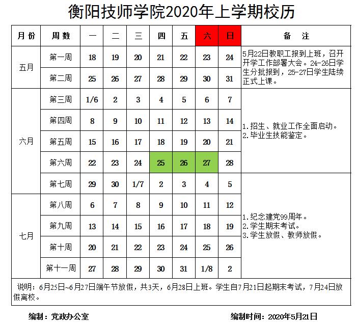 衡陽技師學院2020年上學期校歷