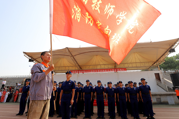 大會上,2021級消防救援專業定向班學員向2022級意向班傳遞班旗,全體領導現場為消防救援專業定向班隊員佩戴紅花。