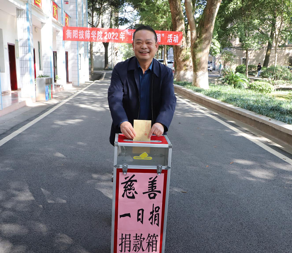 本網訊 10月19日下午,衡陽技師學院“慈善一日捐”活動捐款儀式在院辦公樓前坪火熱開展。在學院黨委書記肖春林、黨委副書記、院長廖與飛帶領下,院領導們向募捐箱投入了一份份愛心善款,隨后,各部門負責人把本部門同志捐贈的善款也紛紛投入了募捐箱。儀式簡約,但愛心濃濃,令十月的校園宛如春天般溫暖。