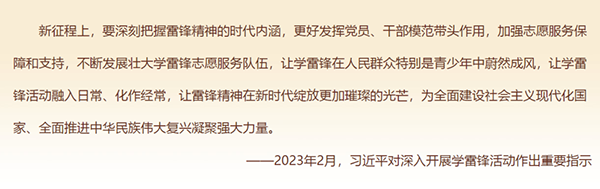2023年2月,習(xí)近平總書記對(duì)深入開展學(xué)雷鋒活動(dòng)作出重要指示指出,今年是毛澤東等老一輩革命家為雷鋒同志題詞60周年。60年來(lái),學(xué)雷鋒活動(dòng)在全國(guó)持續(xù)深入開展,雷鋒的名字家喻戶曉,雷鋒的事跡深入人心,雷鋒精神滋養(yǎng)著一代代中華兒女的心靈。實(shí)踐證明,無(wú)論時(shí)代如何變遷,雷鋒精神永不過(guò)時(shí)。