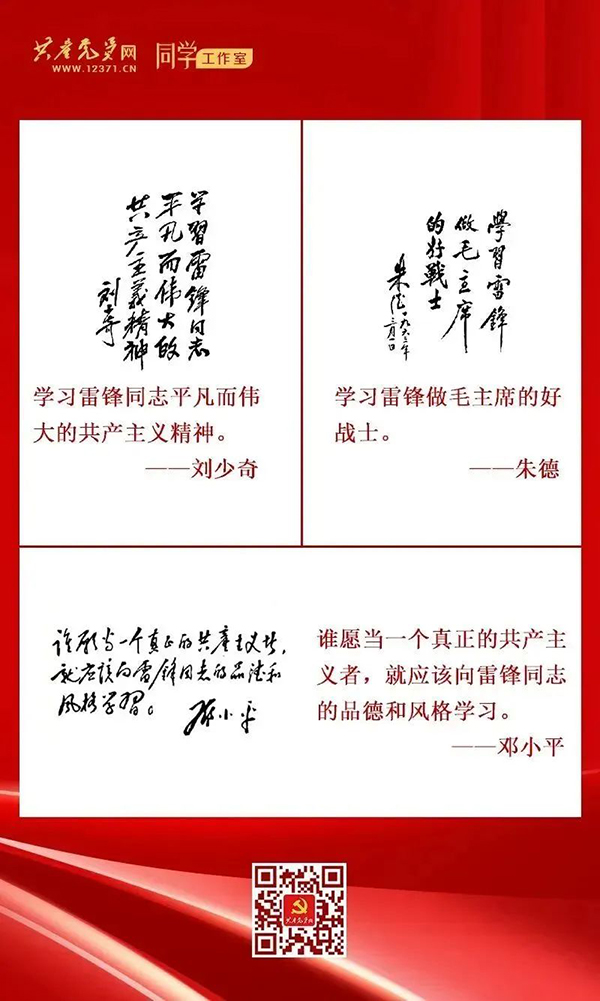 1963年1月7日,國(guó)防部命名雷鋒生前所在班為“雷鋒班”。1963年3月5日,毛澤東“向雷鋒同志學(xué)習(xí)”題詞發(fā)表。隨后,劉少奇、周恩來(lái)、朱德、鄧小平等老一輩革命家也相繼題詞,發(fā)出學(xué)習(xí)雷鋒的偉大號(hào)召。