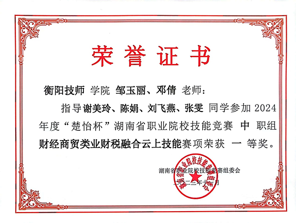 12月23日,2024年度“楚怡杯”湖南省職業院校技能競賽中職組財經商貿類業財稅融合云上賽項落下帷幕,我院經貿旅游學院由張雯、謝美玲、陳娟、劉飛燕組成參賽團隊,從全省各地市州44支參賽隊的激烈比拼中脫穎而出,榮獲湖南省一等獎,指導教師鄒玉麗、鄧倩獲優秀指導教師獎。