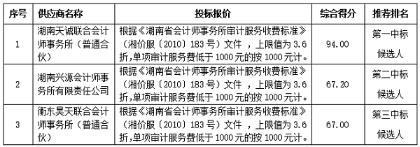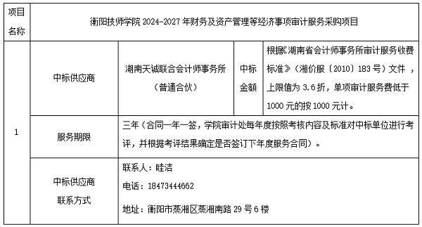 衡陽技師學(xué)院2024-2027年財(cái)務(wù)及資產(chǎn)管理等經(jīng)濟(jì)事項(xiàng)審計(jì)服務(wù)采購項(xiàng)目院內(nèi)自主招標(biāo)于2024年4月15日結(jié)束,現(xiàn)將中標(biāo)結(jié)果公告如下: