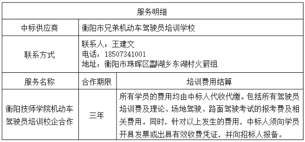 衡陽技師學院機動車駕駛員培訓校企合作項目于2024年5月22日結束,現將中標結果公告如下: