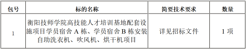 采購項目名稱:衡陽技師學院高技能人才培訓基地配套設施項目學員宿舍A棟、學員宿舍B棟安裝自助洗衣機、吹風機、烘干機項目