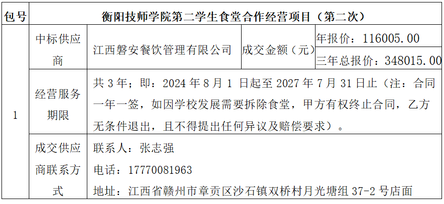 衡陽技師學院的衡陽技師學院第二學生食堂合作經營項目(第二次)競爭性磋商采購于2023年7月12日結束,現將成交結果公告如下: