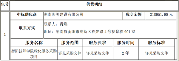 衡陽(yáng)技師學(xué)院的衡陽(yáng)技師學(xué)院綠化服務(wù)采購(gòu)項(xiàng)目公開(kāi)招標(biāo)采購(gòu)項(xiàng)目于2024年07月22日結(jié)束,現(xiàn)將中標(biāo)(成交)結(jié)果公告如下: