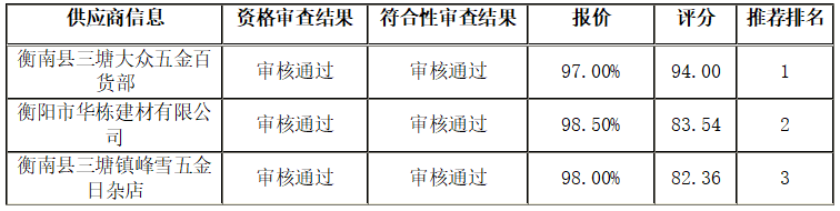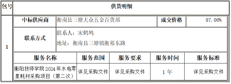 衡陽技師學院2024年水電零星耗材采購項目(第二次)公開招標采購項目于2024年07月30日結束,現將中標(成交)結果公告如下: