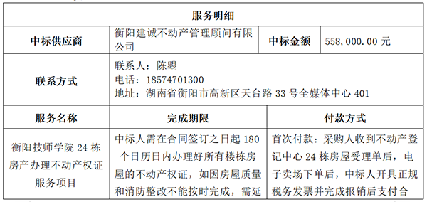 衡陽技師學院24棟房產辦理不動產權證服務項目于2025年01月03日結束,現將中標結果公告如下: