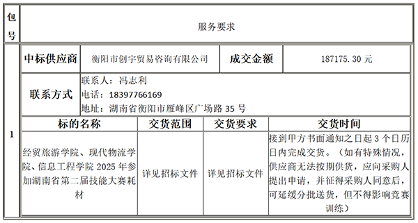 衡陽技師學院的衡陽技師學院參加2025年湖南省第二屆技能大賽耗材采購項目公開招標采購項目于2025年01月13日結束,現將中標(成交)結果公告如下: