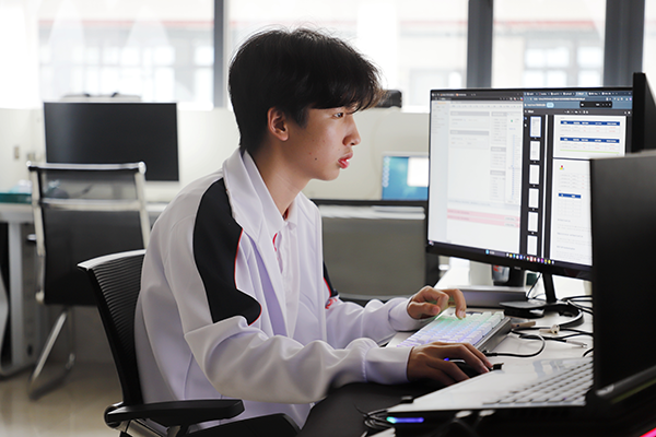 走進公共實訓基地903工作室,鍵盤敲打聲回蕩。從透明的玻璃門望去,陸藝茗專注地敲打著鍵盤,一行行代碼躍然跳動于面前電腦顯示屏上。