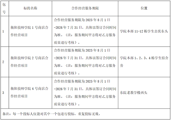 衡陽(yáng)技師學(xué)院的衡陽(yáng)技師學(xué)院1、2、4號(hào)商店合作經(jīng)營(yíng)項(xiàng)目院內(nèi)招標(biāo)于2025年6月18日結(jié)束,現(xiàn)將中標(biāo)結(jié)果公告如下: