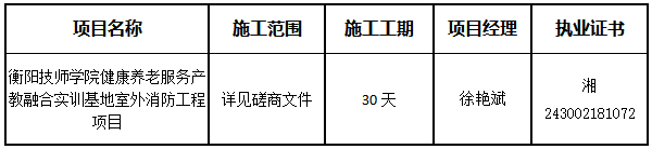 衡陽技師學(xué)院健康養(yǎng)老服務(wù)產(chǎn)教融合實訓(xùn)基地室外消防工程項目于2025年07月10日結(jié)束,現(xiàn)將成交結(jié)果公告如下:
