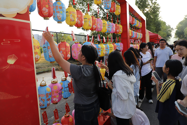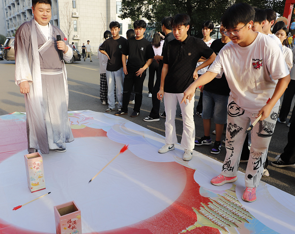 百余條融合民俗知識與詩詞元素的燈謎懸掛于現(xiàn)場,各民族師生在民俗趣猜燈謎區(qū)駐足思索、相互探討,在解謎過程中了解傳統(tǒng)民俗文化。趣味游戲區(qū)人氣爆棚,源自古代禮儀的“投壺”游戲成為現(xiàn)場“爆款”,師生們排隊參與,在瞄準(zhǔn)投擲的互動中體驗古代文人雅趣,感受傳統(tǒng)文化的鮮活生命力。