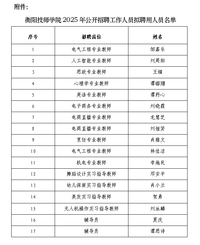 附件:衡陽技師學院2025年公開招聘工作人員擬聘用人員名單