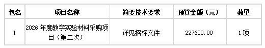 湖南省招標有限責任公司采購代理機構(gòu)受衡陽技師學院的委托,對2026年度教學實驗材料采購項目(第二次)(委托代理編號:0623-2685N1124006 )進行公開招標采購。歡迎符合資格條件的投標人前來投標。