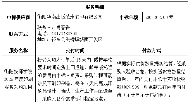 衡陽技師學院2026年度印刷服務采購項目于2026年4月7日結束,現將中標結果公告如下: