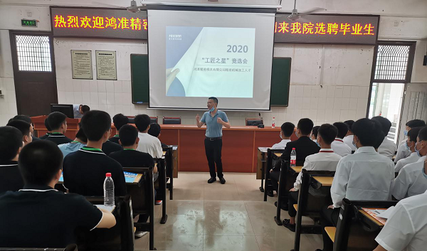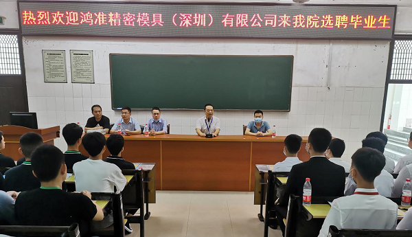 6月10日上午,世界五百強企業——深圳市富士康集團旗下鴻準精密模具(深圳)有限公司來我院對17級鴻準定向班100多名學生舉辦專場招聘會。學院黨委委員、副院長廖與飛、鴻準精密模具人力資源專理朱煒出席招聘會。