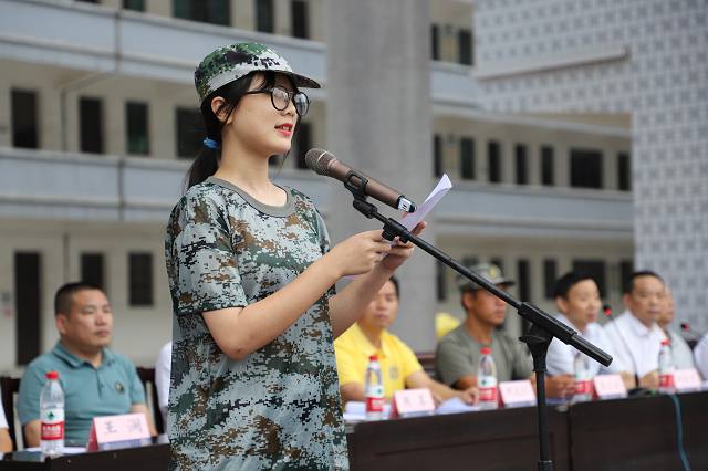 參訓學生代表2020廣告技師班陶宇靚同學上臺發(fā)言,表達了堅持訓練,認真接受國防教育的決心。承諾軍訓期間學習軍人的愛國風采,傳承軍人的吃苦精神,練就軍人的錚錚傲骨,迎難而上,磨煉意志,向學校、教官、向親人送上一份滿意的答卷。