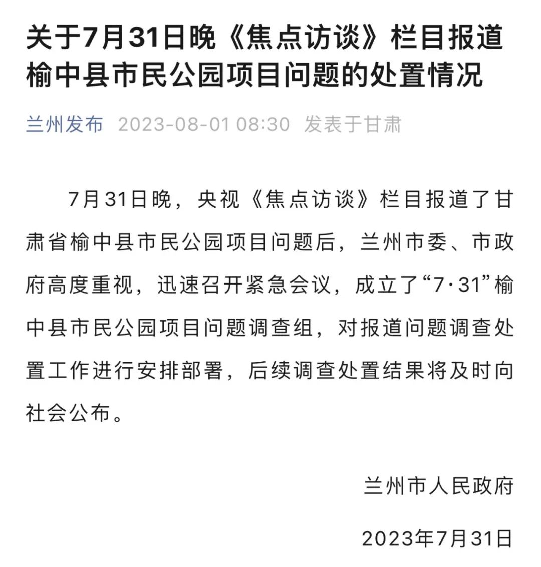 《焦點訪談》報道甘肅省榆中縣財政吃緊卻為市民公園負債20年,官方成立調查組,央視網評“面子與里子”