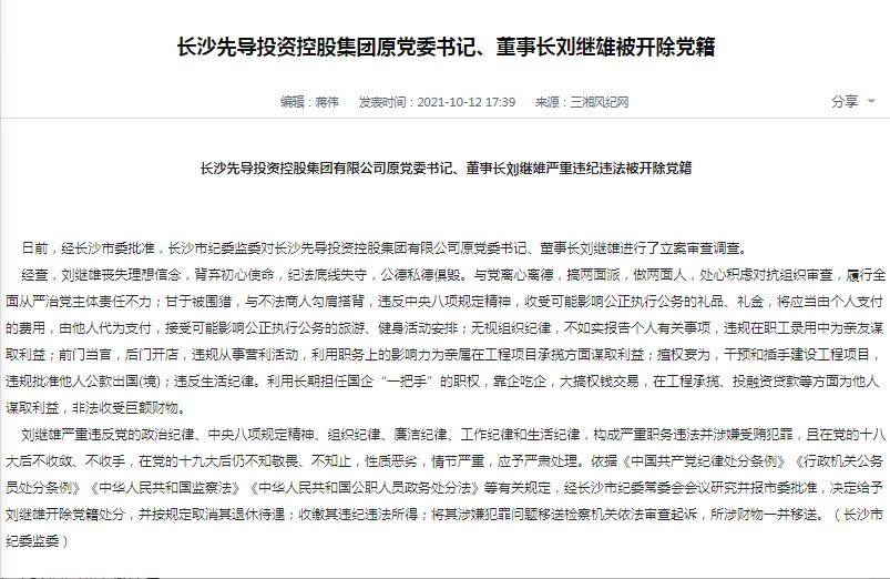 長沙先導投資控股集團有限公司原黨委書記、董事長劉繼雄安排19名親友到公司任職……