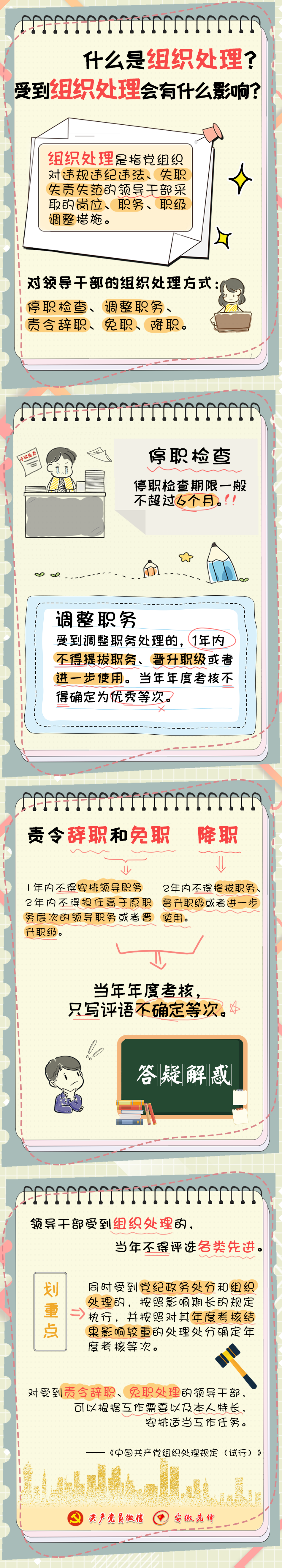 第十一條 停職檢查期限一般不超過6個月。受到調(diào)整職務處理的,1年內(nèi)不得提拔職務、晉升職級或者進一步使用。受到責令辭職、免職處理的,1年內(nèi)不得安排領導職務,2年內(nèi)不得擔任高于原職務層次的領導職務或者晉升職級。受到降職處理的,2年內(nèi)不得提拔職務、晉升職級或者進一步使用。同時受到黨紀政務處分和組織處理的,按照影響期長的規(guī)定執(zhí)行。