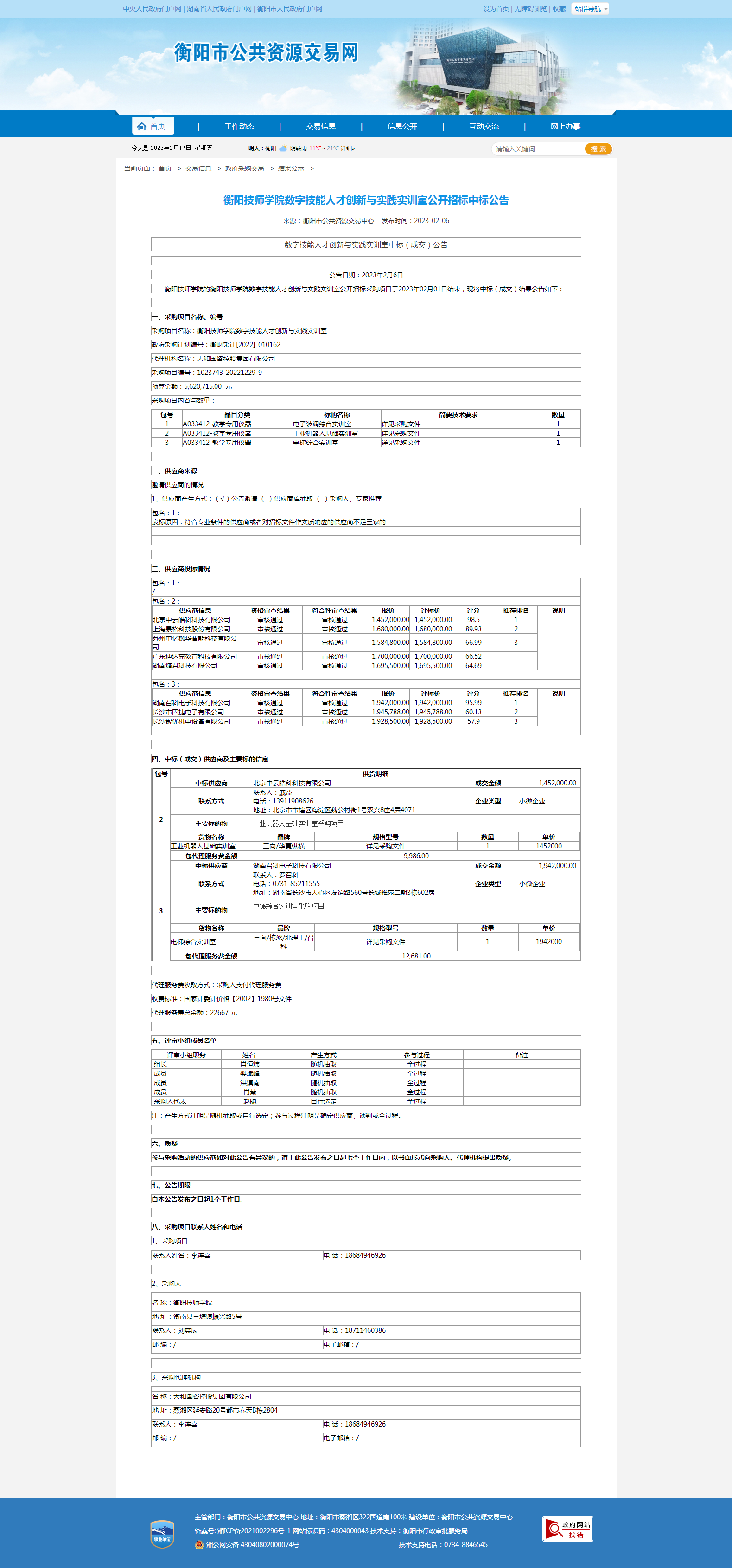 衡陽技師學院數字技能人才創新與實踐實訓室公開招標中標公告