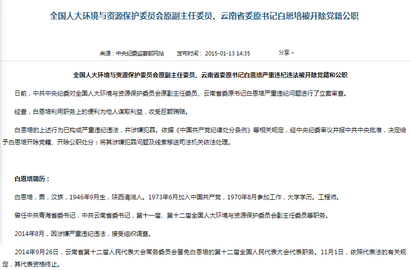 白恩培(全國人大環資委原副主任):我自己腐敗了,但是我非常期盼中央能夠加大反腐敗的力度。十八大以后中央采取從嚴治黨的一系列措施,嚴肅查處腐敗,這就是黨的希望,只有這樣子我們黨才能夠承擔起歷史責任。