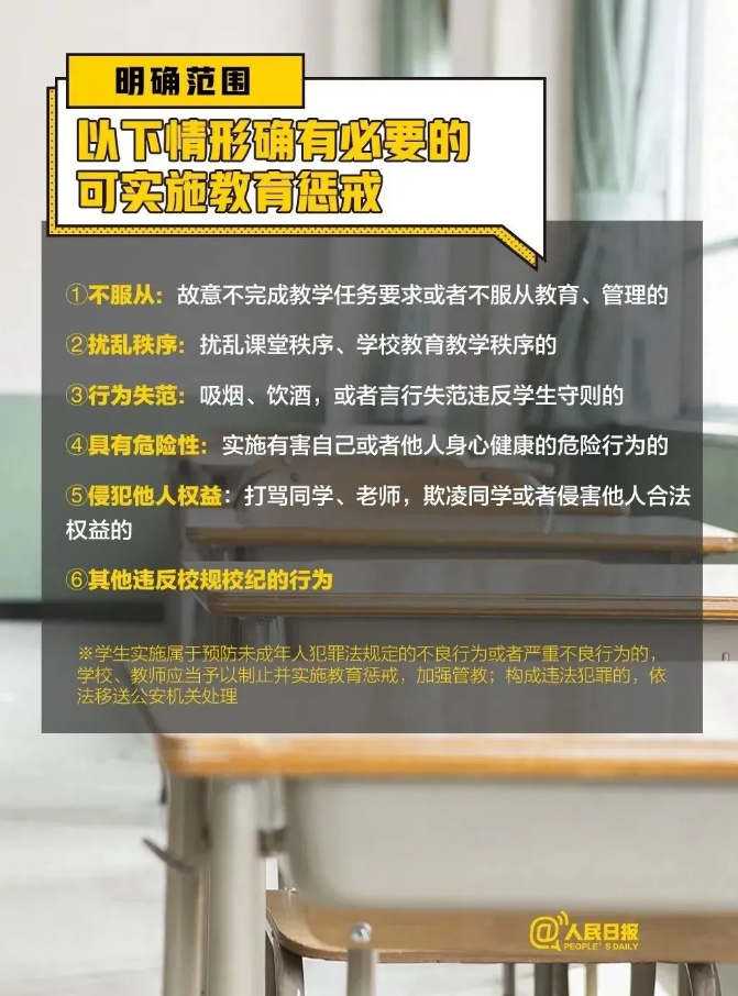 《規則》對應當給予教育懲戒的情形作了具體化,規定在確有必要的情況下,學校、教師可以在學生存在不服從、擾亂秩序、行為失范、具有危險性、侵犯權益等情形時實施教育懲戒。不服從,指學生主觀不完成其基本的學習任務,包括故意不完成教學任務要求或者不服從學校的教育、管理要求;擾亂秩序,包括擾亂課堂秩序和學校教育教學秩序,即學生的個體行為已經在一定范圍產生了不良影響;行為失范,主要指吸煙、飲酒以及其他違反學生守則的行為;具有危險性,指學生實施有害自己或者他人身心健康的危險行為;侵犯權益,指學生打罵同學、老師,欺凌同學或者侵害他人合法權益的行為。此外,《規則》與《預防未成年人犯罪法》相銜接,規定學生實施屬于《預防未成年人犯罪法》規定的不良行為或者嚴重不良行為的,學校、教師應當予以制止并實施教育懲戒,加強管教。