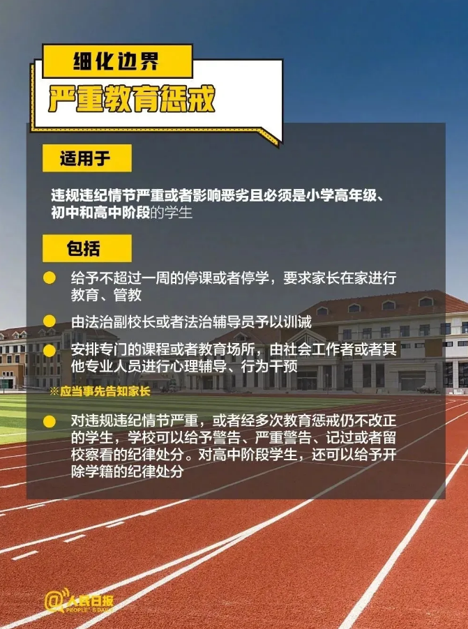 第十條 小學高年級、初中和高中階段的學生違規違紀情節嚴重或者影響惡劣的,學校可以實施以下教育懲戒,并應當事先告知家長: