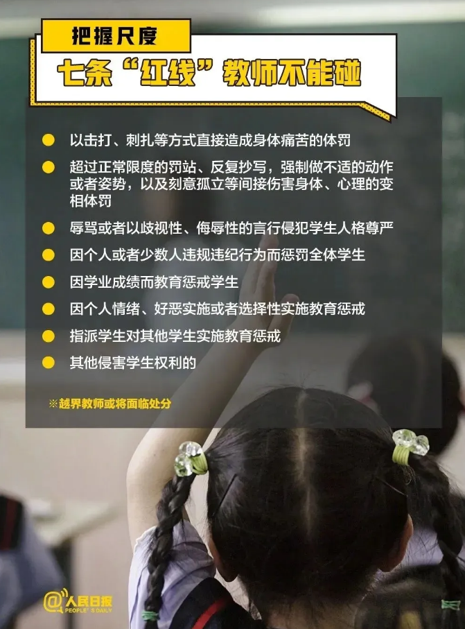 教育懲戒與體罰和變相體罰是不同性質的行為。為了防止實踐中個別教師將體罰和變相體罰作為教育懲戒實施,《規則》專門對禁止實施的七類不當教育行為作了明確和細化。一是身體傷害,以擊打、刺扎等方式直接造成身體痛苦的體罰;二是超限度懲罰,超過正常限度的罰站、反復抄寫,強制做不適的動作或者姿勢,以及刻意孤立等間接傷害身體、心理的變相體罰;三是言行侮辱貶損,辱罵或者以歧視性、侮辱性的言行侵犯學生人格尊嚴;四是因個人或者少數人違規違紀行為而懲罰全體學生;五是因學生個人的學習成績而懲罰學生;六是因個人情緒、好惡實施或者選擇性實施教育懲戒;七是指派學生代替自己對其他學生實施教育懲戒。通過劃定這些“紅線”,有利于教師規范行為、把握尺度,也有利于學生、家長和社會監督。
