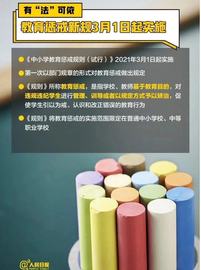 《中小學教育懲戒規則(試行)》已經2020年9月23日教育部第3次部務會議審議通過,現予公布,自2021年3月1日起施行。