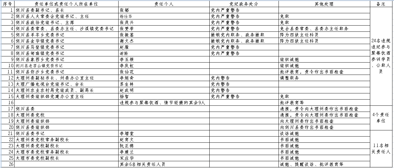 對24名違規(guī)違紀(jì)參與聚餐飲酒參訓(xùn)學(xué)員、公職人員的處理:給予劍川縣委副書記、縣長張韜黨內(nèi)嚴(yán)重警告處分;給予劍川縣人大常委會黨組書記、主任楊仕華黨內(nèi)嚴(yán)重警告處分,免職;給予劍川縣政協(xié)黨組書記、主席張茂興黨內(nèi)嚴(yán)重警告處分,免職;給予劍川縣委常委、縣委辦主任、沙溪鎮(zhèn)黨委書記張燮舉黨內(nèi)嚴(yán)重警告處分,免去縣委常委、縣委辦主任職務(wù);給予劍川縣羊岑鄉(xiāng)黨委書記張振基撤銷黨內(nèi)職務(wù)、政務(wù)撤職處分,降為四級主任科員;給予劍川縣金華鎮(zhèn)黨委書記謝文杰撤銷黨內(nèi)職務(wù)、政務(wù)撤職處分,降為四級主任科員;給予劍川縣馬登鎮(zhèn)黨委書記趙雁黨內(nèi)嚴(yán)重警告處分;給予劍川縣甸南鎮(zhèn)黨委書記謝勤黨內(nèi)嚴(yán)重警告處分;給予劍川縣象圖鄉(xiāng)黨委書記李玉根組織誡勉;給予劍川縣老君山鎮(zhèn)黨委書記李慶虹組織誡勉;對劍川縣彌沙鄉(xiāng)黨委書記張仙花批評教育,責(zé)令作出書面檢查;給予大理州委副秘書長、州委辦公室主任李炳奇黨內(nèi)警告處分,調(diào)整職務(wù);給予大理廣播電視臺黨組書記、臺長蘇生林黨內(nèi)警告處分;給予大理州農(nóng)業(yè)農(nóng)村局黨組成員、副局長趙成明黨內(nèi)警告處分;給予大理州委組織部黨建辦公室主任楊智黨內(nèi)嚴(yán)重警告處分,免職;對違規(guī)參與聚餐飲酒、情節(jié)輕微的其余9人給予批評教育等處理。