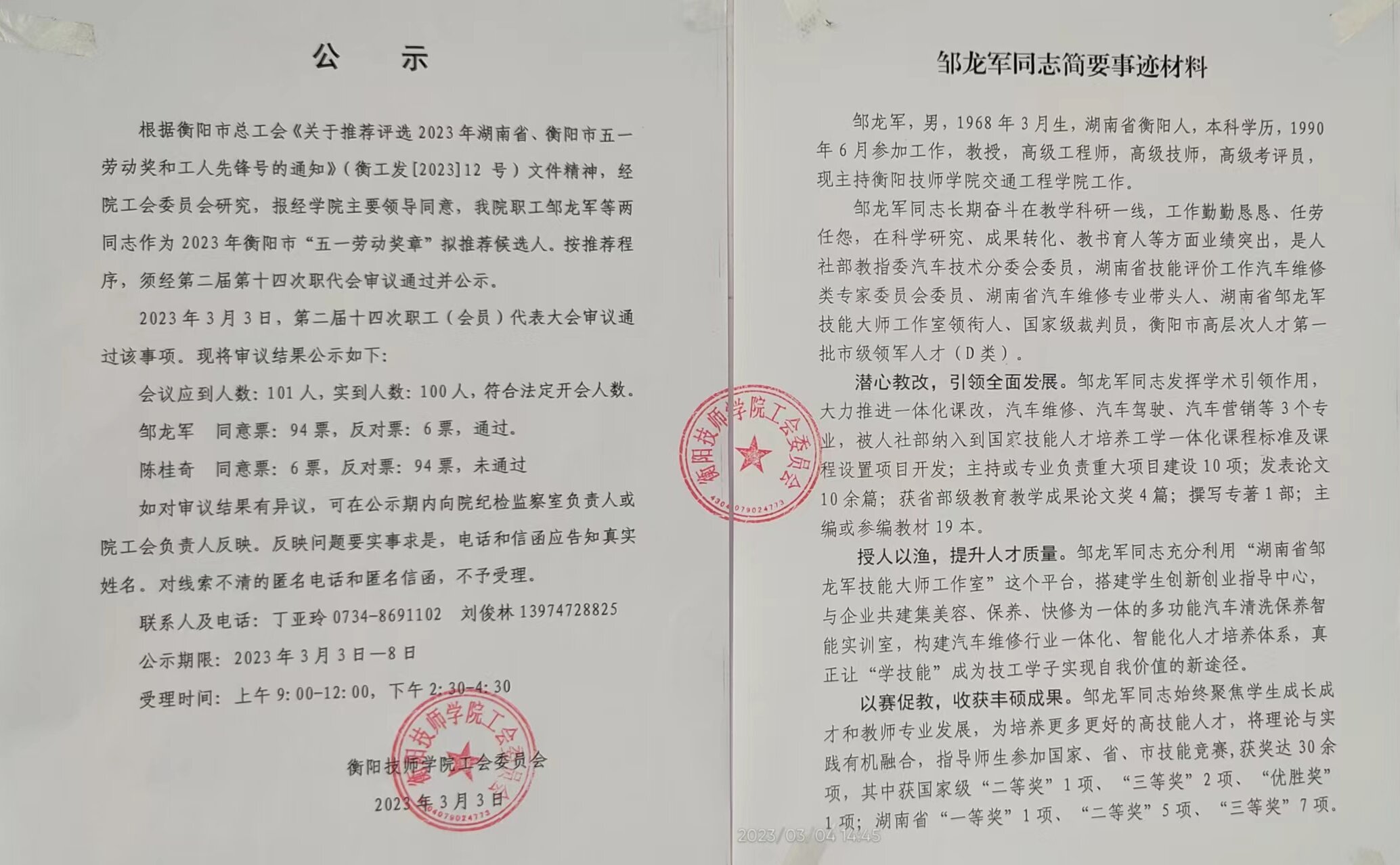 衡陽技師學(xué)院2023年衡陽市五一勞動獎?wù)聰M推薦候選人公示
