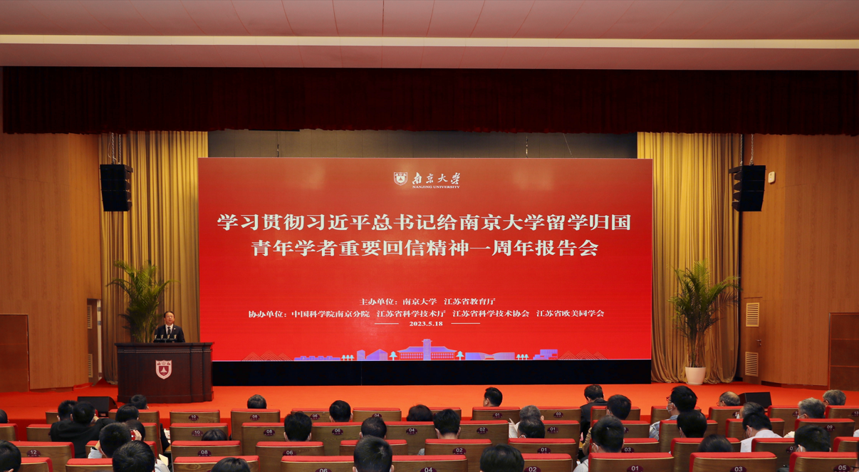 5月18日,學習貫徹習近平總書記給南京大學留學歸國青年學者重要回信精神報告會在仙林校區舉行。全省教科研機構留學歸國學者、科研人員代表等300余人齊聚一堂,共同重溫習近平總書記給南京大學留學歸國青年學者重要回信精神,努力在江蘇大地上“報效國家、服務人民”,為全面建設社會主義現代化國家、實現中華民族偉大復興中國夢再創佳績、爭做表率。