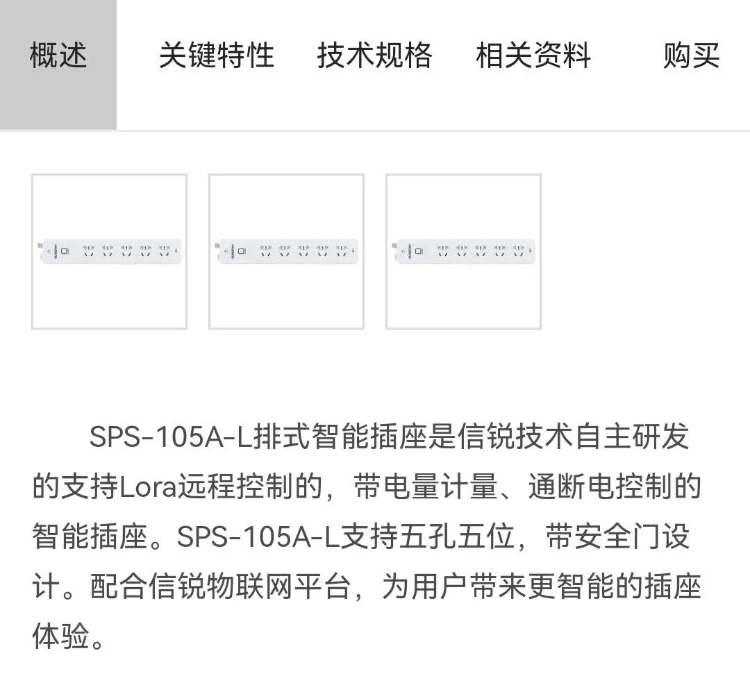 SPS105A-L智能用電管理設備廠家官網顯示,這是一款具有電量計量、通斷電控制功能的“排式智能插座”,支持五孔五位,帶安全門設計,配合物聯網平臺使用,可通過app遠程控制,在大功率或突增功率下自動斷電和警告。