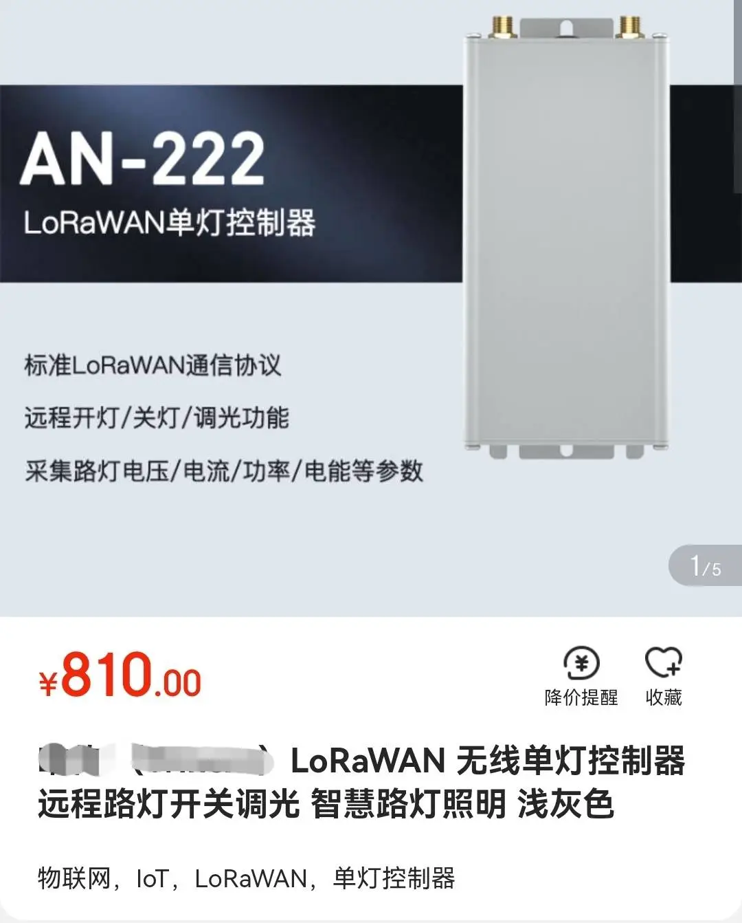 廠商官網顯示,AN222單燈控制器是一款路燈節能產品,可以對單盞路燈的電壓、電流、功率、電能等工作參數進行監控與采集,同時具有控制路燈開關和調光等功能。該公司電商平臺的旗艦店中,同型號產品售價為810元。