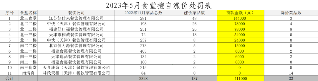 近期,接到多起學生投訴食堂菜價高的反映,學校高度重視。經查發現個別食堂確實存在對部分菜品未經報審擅自漲價的行為。 經研究決定,對擅自漲價食堂和業務管理人員嚴肅處理,具體措施如下: 1. 對擅自漲價菜品的當事食堂按照每漲價一個菜品罰款3000元的額度進行罰款處理,要求立刻下調價格并在食堂價目表顯示。對降價菜品較多的南校區清真食堂獎勵2000元。所罰款項納入餐飲管理中心獎罰基金,??顚S茫糜诟纳茖W生膳食工作。 2. 對負有具體監管職責的餐飲管理中心食堂管理專員4人,每人罰款2000元。 3. 相關處罰情況餐飲管理中心將函告各餐飲公司總部,要求各總部提出強化管理整改措施。 中航大產業公司餐飲管理中心歡迎廣大師生持續對餐飲管理工作提出寶貴的意見和建議,促進餐飲服務保障工作高質量發展。同時餐飲管理中心會以本次檢查通報為契機,堅持問題導向和目標導向,繼續增強服務師生意識,積極主動回應師生訴求,進一步加強服務監管水平。 中航大產業公司餐飲管理中心 2023-6-5