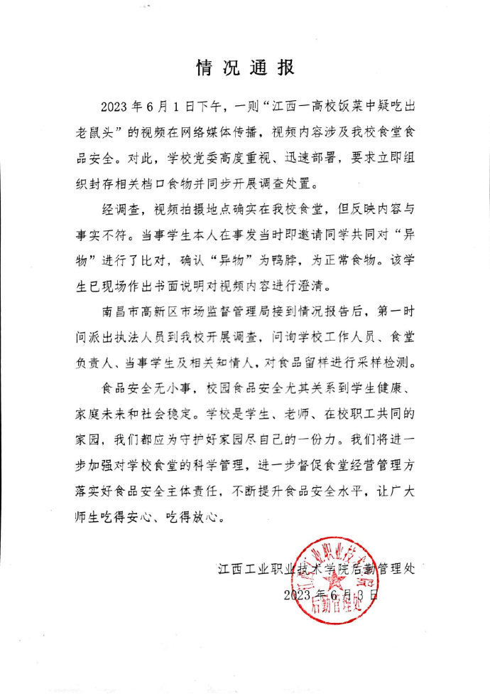 聯(lián)合調(diào)查組經(jīng)勘察現(xiàn)場,調(diào)取監(jiān)控視頻發(fā)現(xiàn),6月1日,學(xué)生在食堂吃出疑似為“鼠頭”的異物,被涉事食堂工作人員事發(fā)當日丟棄。通過查看食堂后廚視頻,查閱采購清單,詢問涉事食堂負責人、后廚相關(guān)當事人、當事學(xué)生和現(xiàn)場圍觀學(xué)生等,判定異物不是鴨脖。根據(jù)國內(nèi)權(quán)威動物專家對提取的當事學(xué)生所拍現(xiàn)場照片和視頻進行專業(yè)辨識,判定異物為老鼠類嚙齒動物的頭部。南昌高新區(qū)市場監(jiān)督管理局昌東分局、江西工業(yè)職業(yè)技術(shù)學(xué)院未認真調(diào)查取證,發(fā)布“異物為鴨脖”結(jié)論是錯誤的。