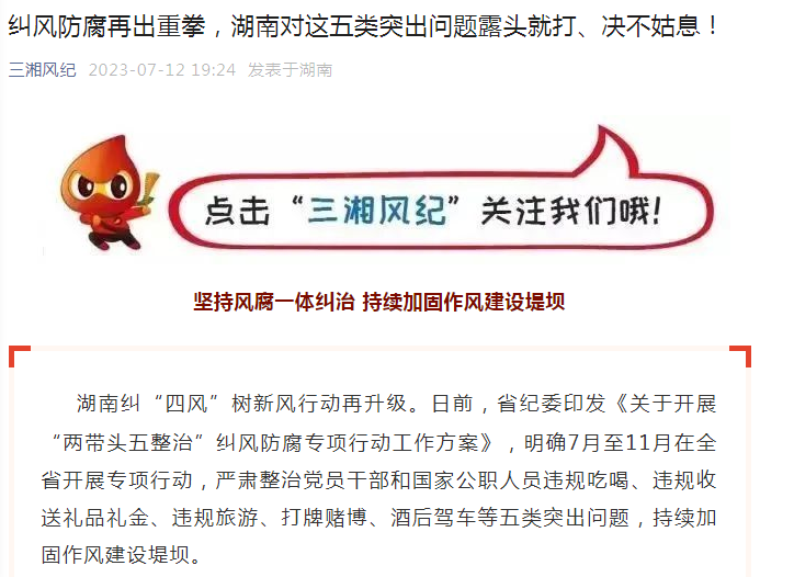 湖南糾“四風(fēng)”樹新風(fēng)行動再升級。日前,省紀(jì)委印發(fā)《關(guān)于開展“兩帶頭五整治”糾風(fēng)防腐專項行動工作方案》,明確7月至11月在全省開展專項行動,嚴(yán)肅整治黨員干部和國家公職人員違規(guī)吃喝、違規(guī)收送禮品禮金、違規(guī)旅游、打牌賭博、酒后駕車等五類突出問題,持續(xù)加固作風(fēng)建設(shè)堤壩。