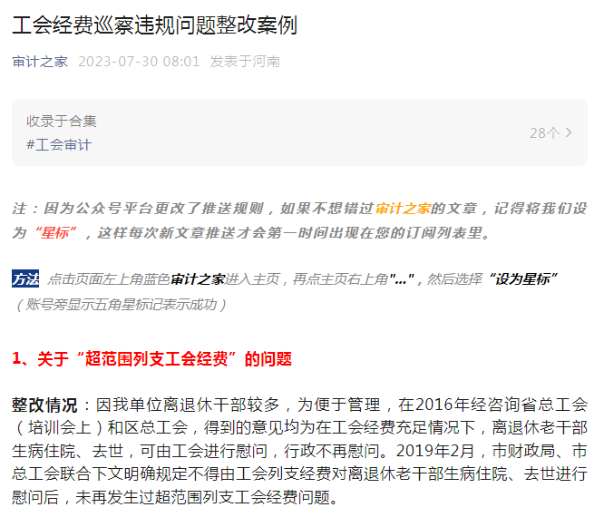 整改情況:因我單位離退休干部較多,為便于管理,在2016年經咨詢省總工會(培訓會上)和區總工會,得到的意見均為在工會經費充足情況下,離退休老干部生病住院、去世,可由工會進行慰問,行政不再慰問。2019年2月,市財政局、市總工會聯合下文明確規定不得由工會列支經費對離退休老干部生病住院、去世進行慰問后,未再發生過超范圍列支工會經費問題。