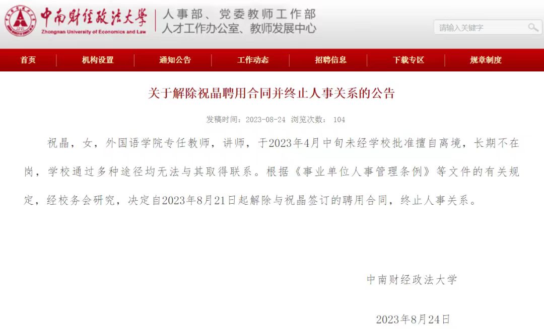 中南財經政法大學教師祝晶未經學校批準擅自離境,長期不在崗,無法取得聯系,被解除聘用合同