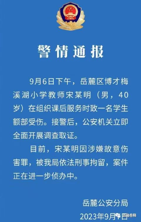岳麓區博才梅溪湖小學教師宋某明涉嫌故意傷害學生致額部受傷