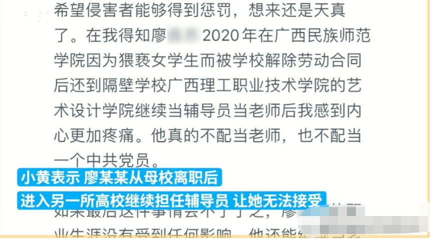 當她得知廖先生因為猥褻女學生的行為,被廣西民族師范學院解除勞動合同,并繼續在廣西理工職業技術學院的藝術設計學院擔任輔導員和教師時,她內心感到更加痛苦。