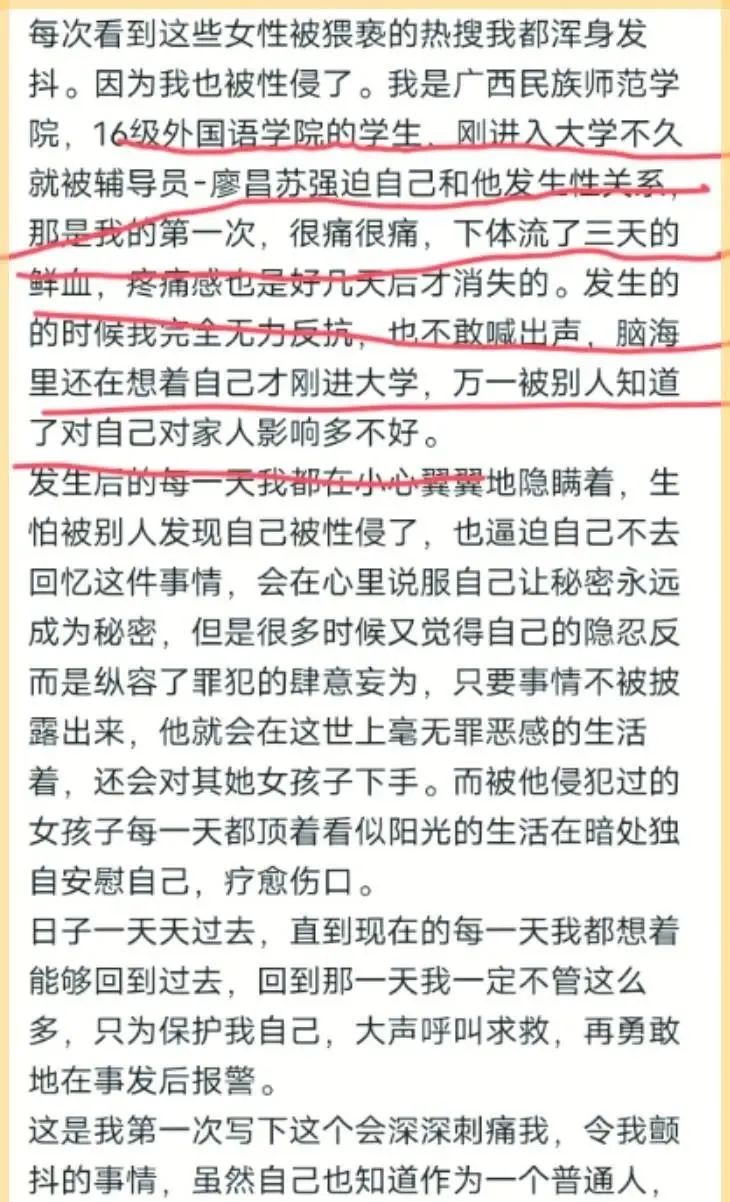 近日,廣西民族師范學院16級畢業女大學生(就讀于外國語學院)在網絡平臺上公開指控,在她大一的時候遭受了外國語學院輔導員的性侵 。