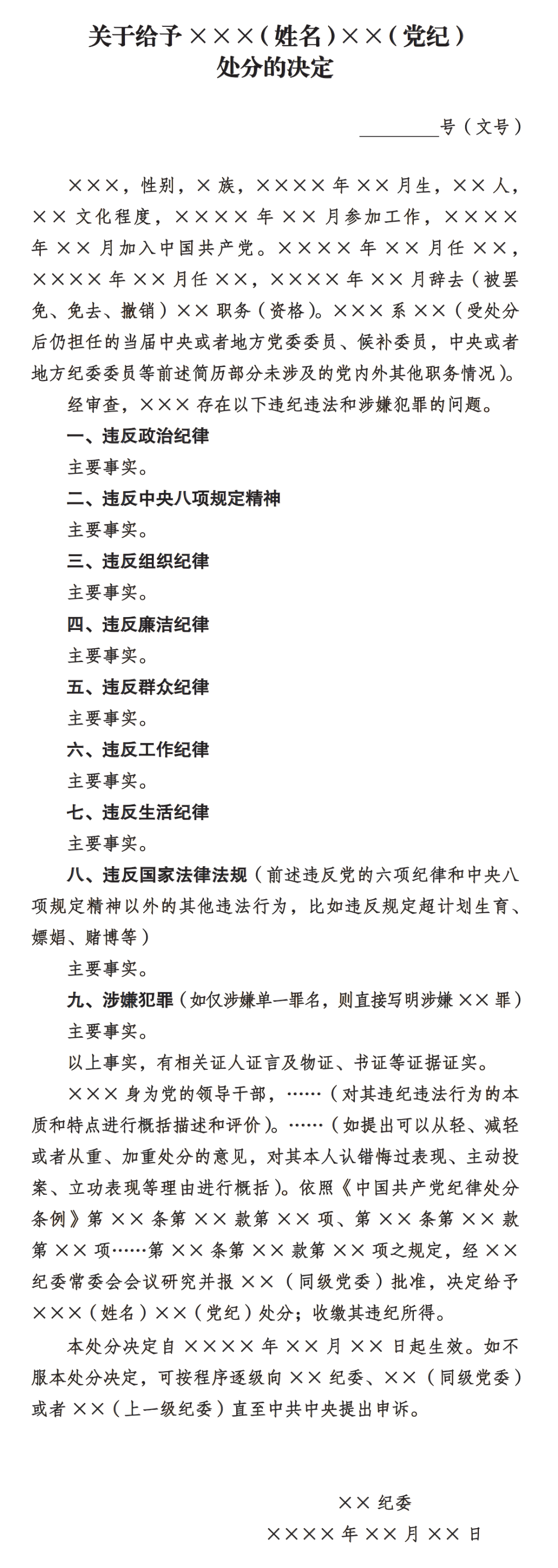 黨紀處分決定書模板