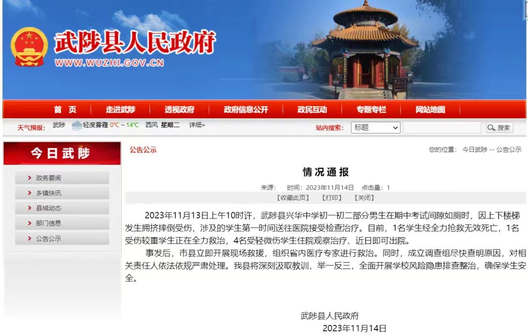 武陟縣人民政府關于興華中學學生因樓梯擁擠發生踩塌事故的情況通報