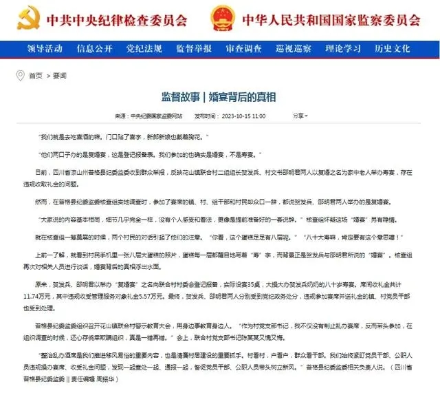 不僅是賀雪梅、李俊案,四川省紀委監委梳理近年來多起案件發現,一些基層干部借婚喪嫁娶事宜收禮斂財,群眾苦不堪言。前不久,涼山州普格縣花山鎮聯合村二組組長賀發兵和村文書邵明君因舉辦“復婚宴”而被當地紀委處分的案例引起了廣泛關注。經查,賀發兵和邵明君兩人以舉辦“復婚宴”之名向村委會登記報備,但實際上是為了給賀發兵的奶奶舉辦80歲壽宴。他們不僅沒有遵守相關規定,還借機收取了村民的禮金5.57萬元。