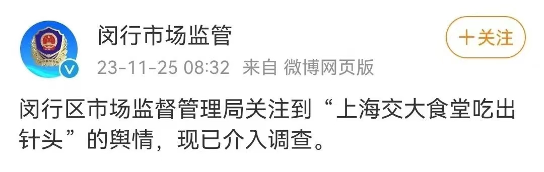 閔行區(qū)市監(jiān)局介入調查“上海交大食堂吃出針頭”輿情事件