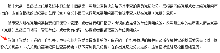 《中國共產黨處分違紀黨員批準權限和程序規定》第16條第3款規定“黨組(黨委)、黨的工作機關、中央和地方黨委直屬事業單位、由黨的工作機關管理的機關以及所在機關黨的基層委員會、機關黨的基層紀律檢查委員會在作出黨紀處分決定前,應當征求派駐紀檢監察組意見。”